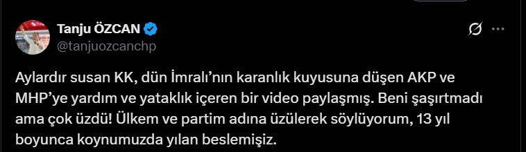 Sosyal medya hesabı üzerinden Kemal Kılıçdarıoğlu’nun sözlerine cevap veren Tanju Özcan, “Aylardır susan Kemal Kılıçdaroğlu, dün İmralı’nın karanlık kuyusuna düşen AKP ve MHP’ye yardım ve yataklık içeren bir video paylaşmış. Beni şaşırtmadı ama çok üzdü! Ülkem ve partim adına üzülerek söylüyorum, 13 yıl boyunca koynumuzda yılan beslemişiz” ifadelerini kullandı.